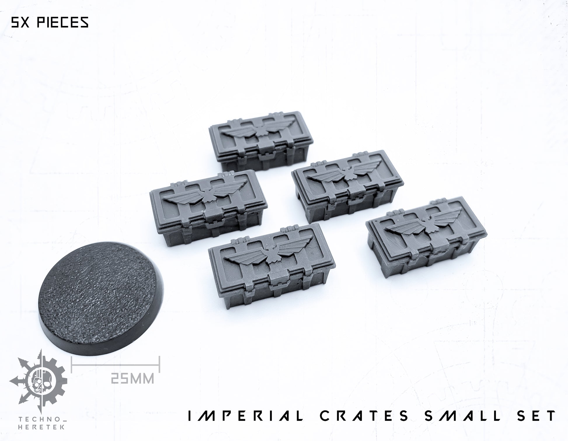 Grimdark and gothic-styled imperial crates to decorate your miniatures, terrains, and dioramas. Perfect to show how the imperium has an ample supply!