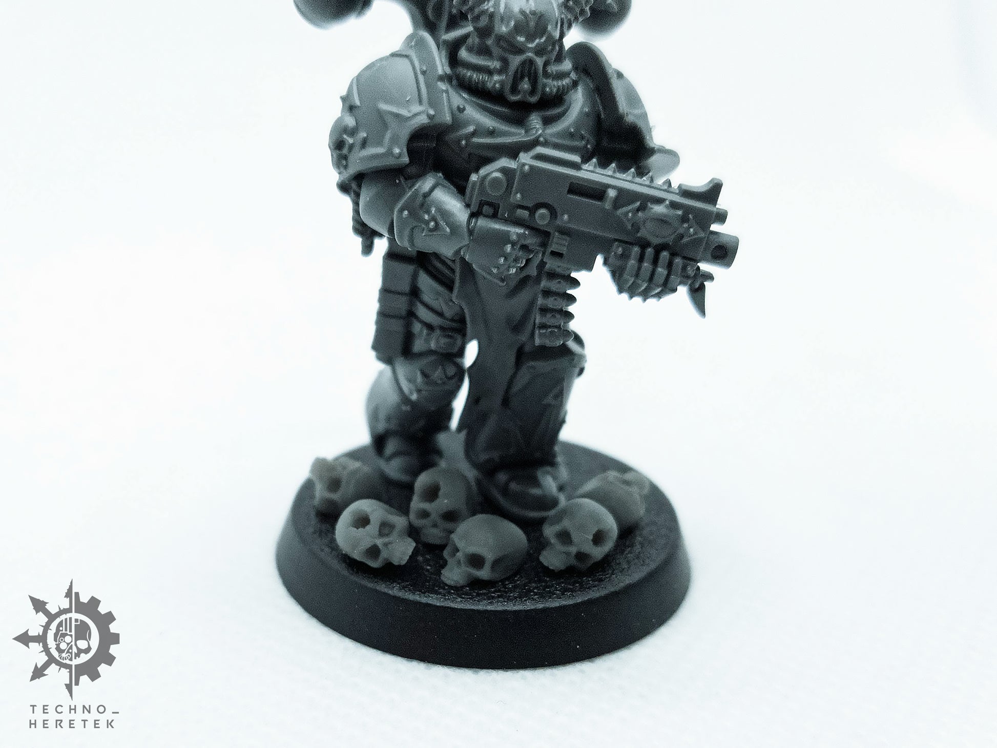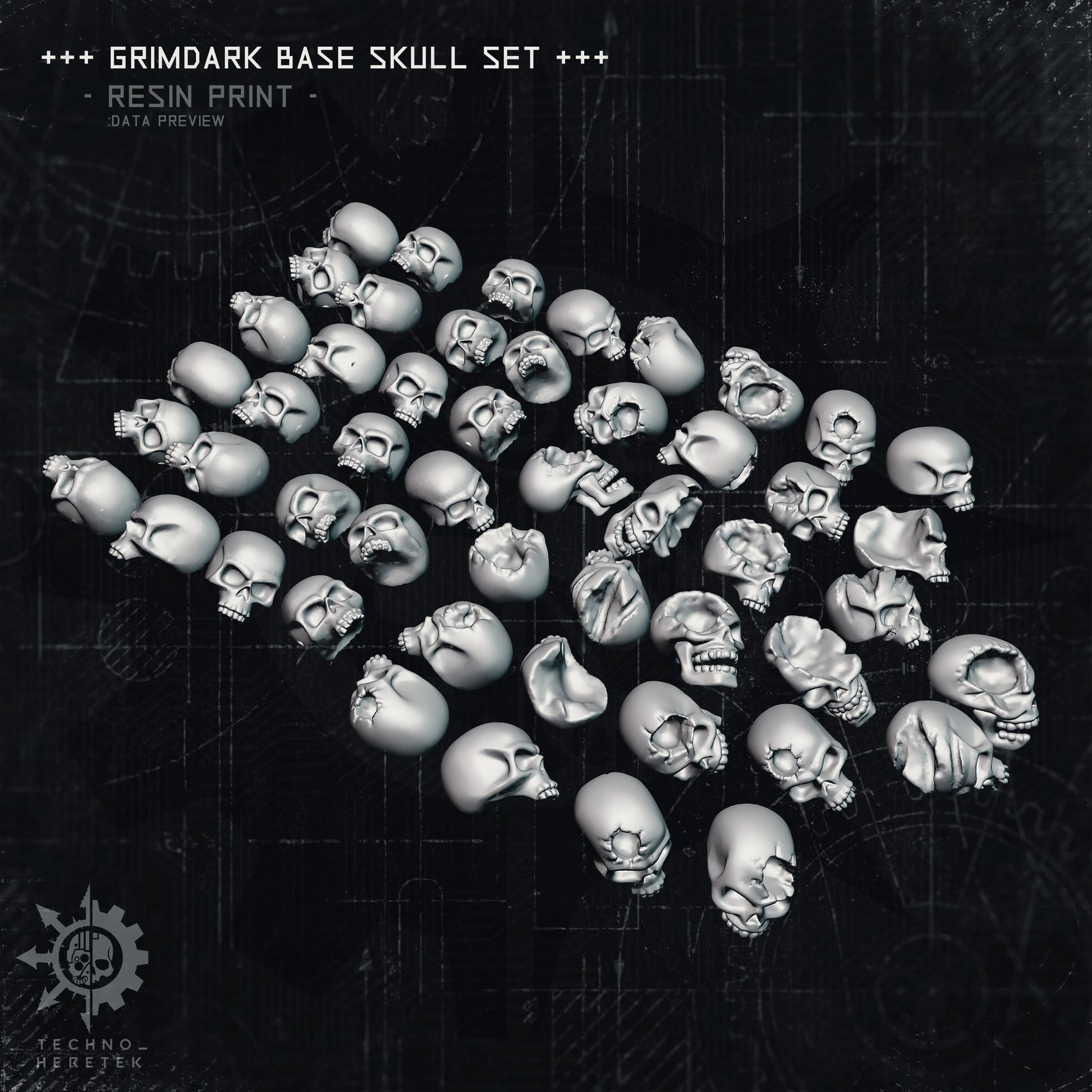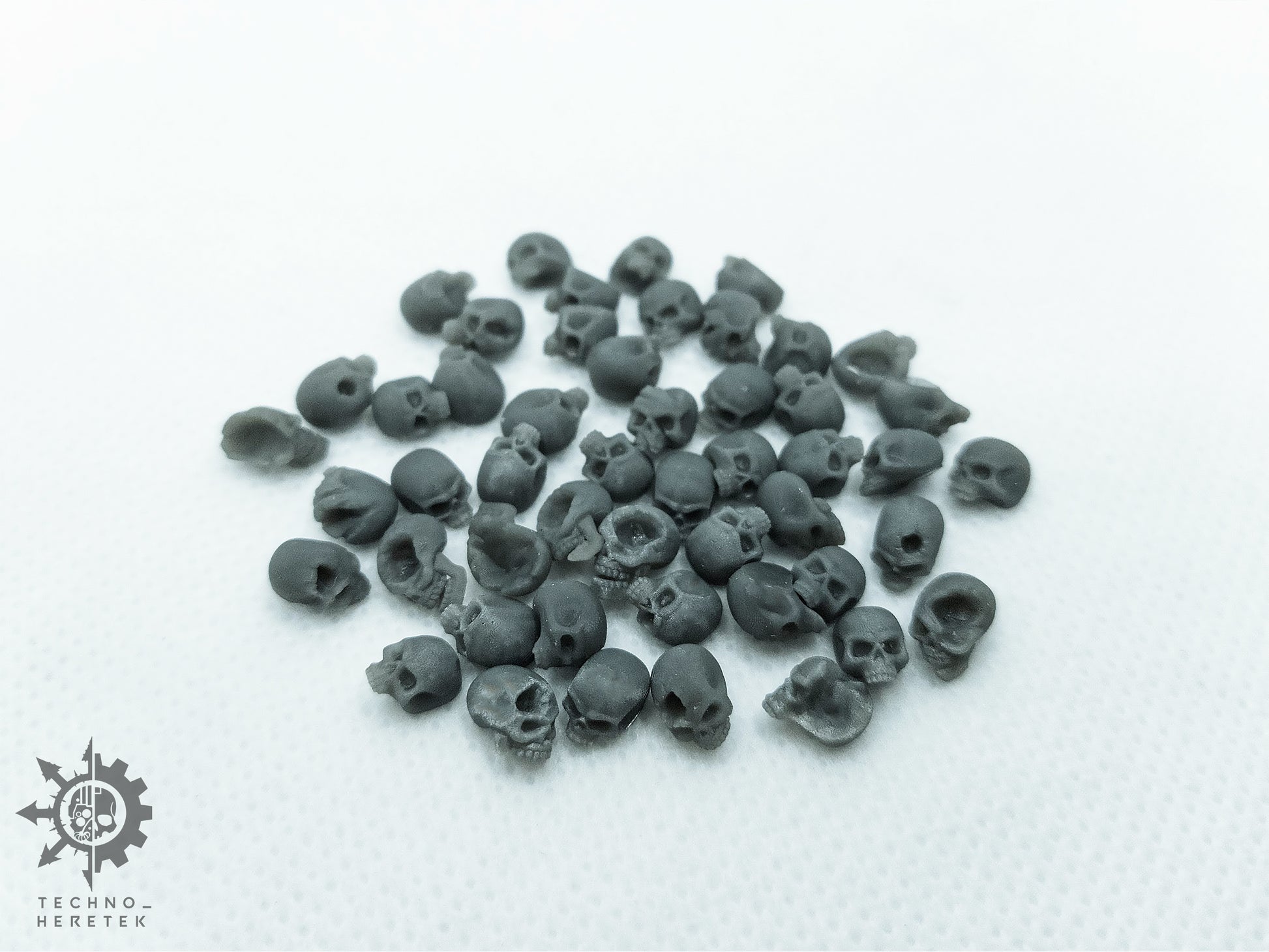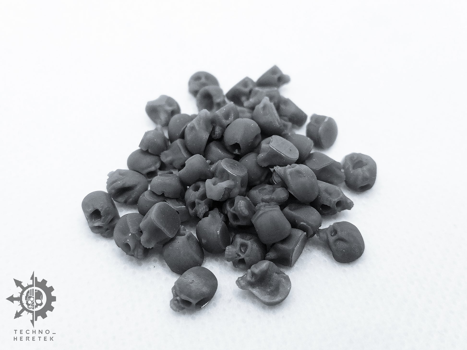Some classy, grimdark skulls and helmets to decorate your miniatures, terrains, and dioramas. They have a small flat side on their backside for easier decoration. And come in many different angles and degrees of damage.