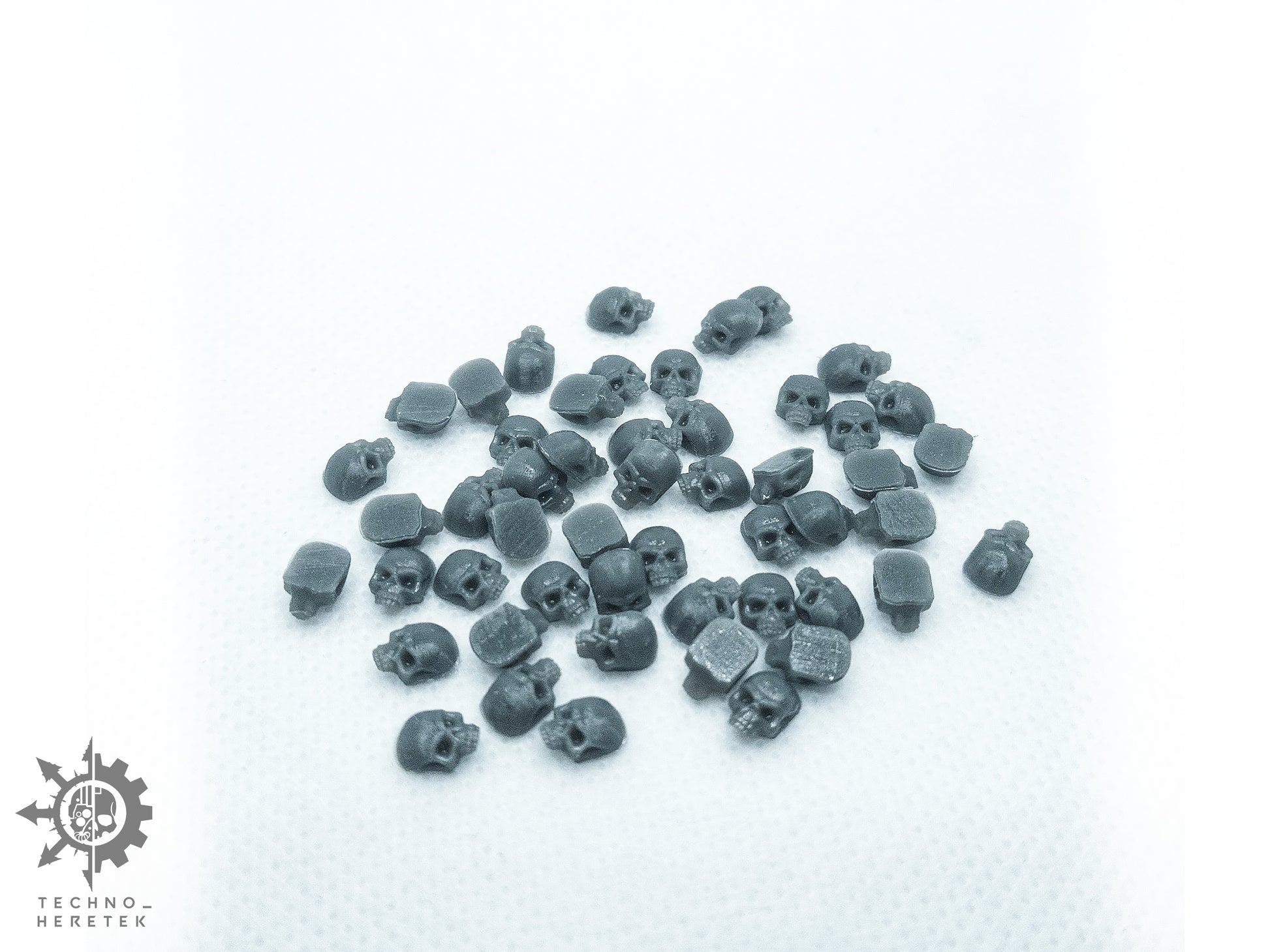 Some classy, grimdark skulls to decorate your miniatures, terrains, and dioramas. They have a flat side on their backside for easier decoration on surfaces. Perfect for decoration your buildings, bases and of course all sorts of Chaos things.