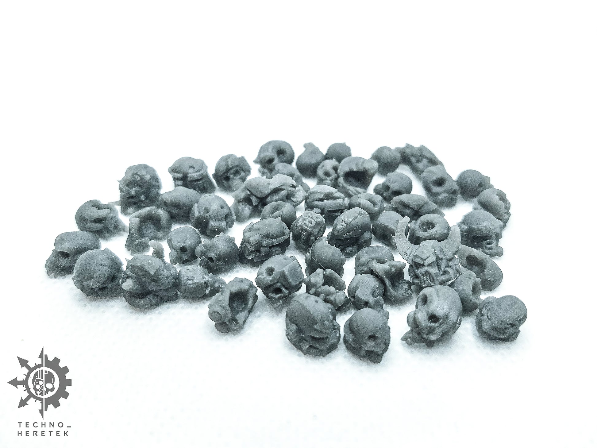 A selection of grimdark skulls and helmets to decorate your miniatures, terrains, and dioramas. They come in many different styles, factions, and degrees of damage.