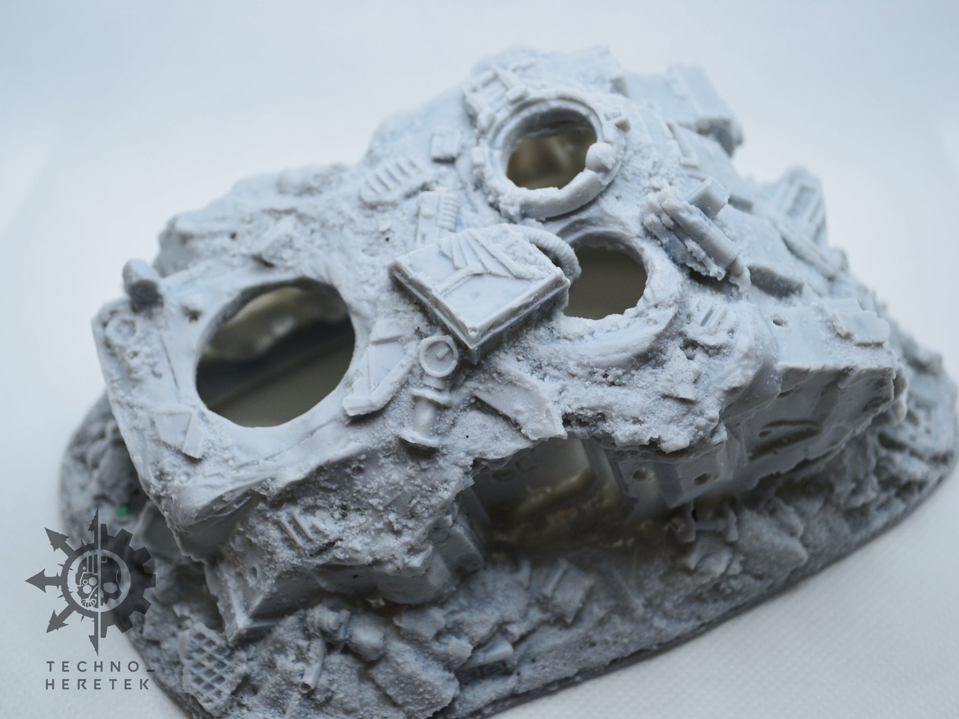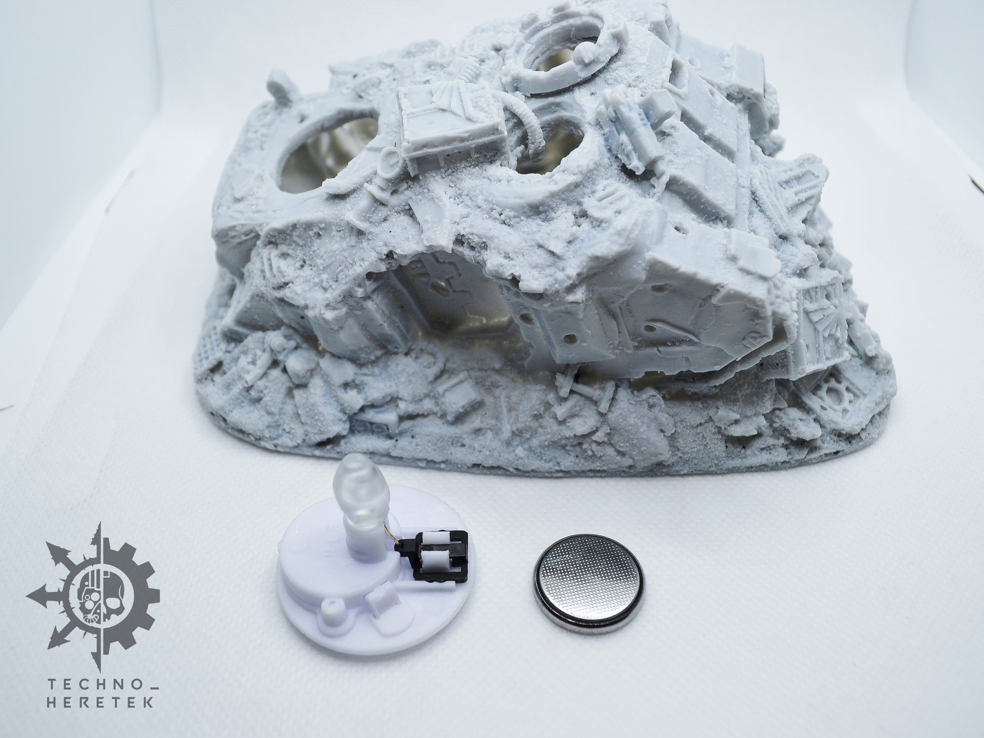 A wrecked transport tank as terrain piece with optional LED lighting effects to better immerse you into atmospheric and narrative wargames scenarios and missions.