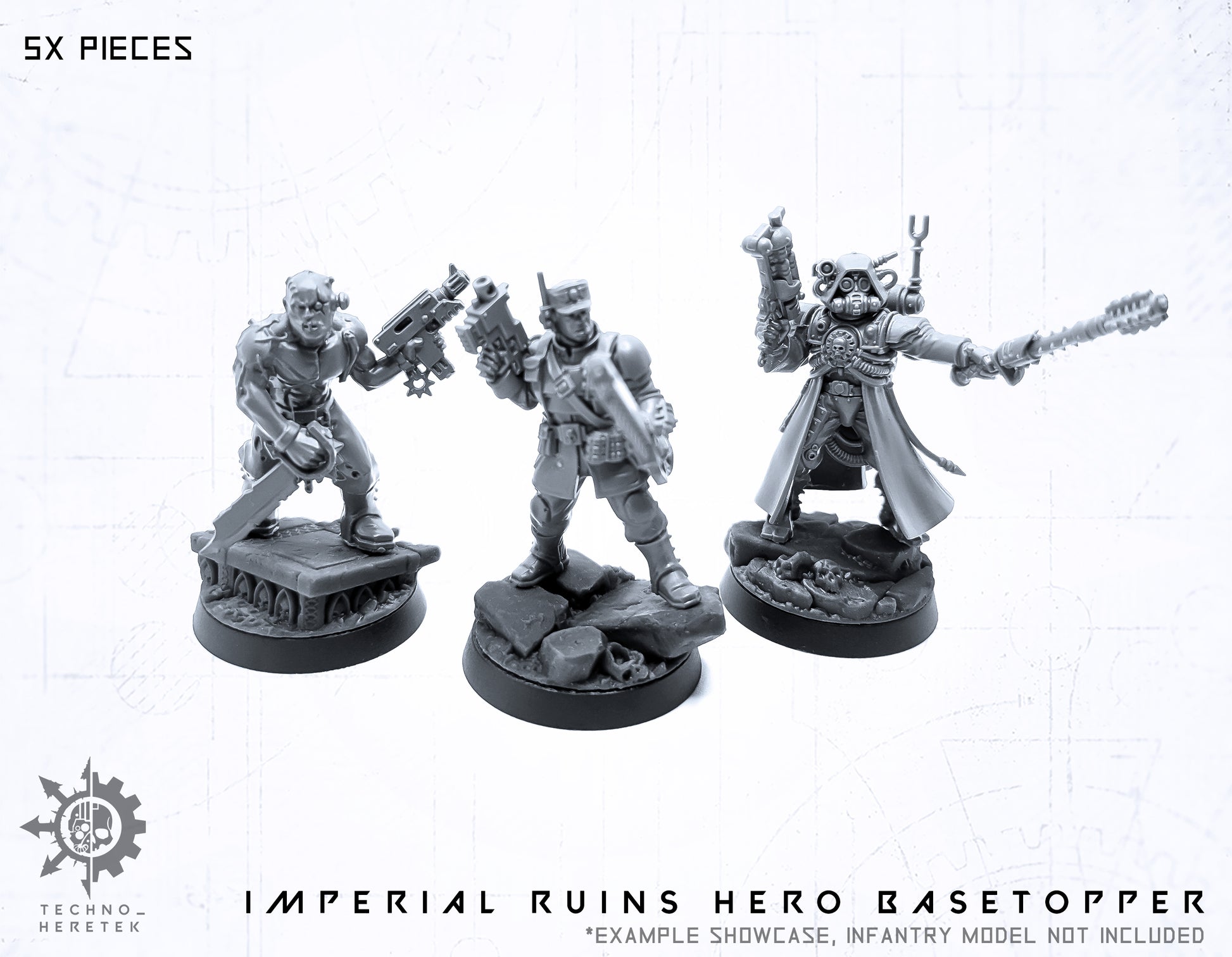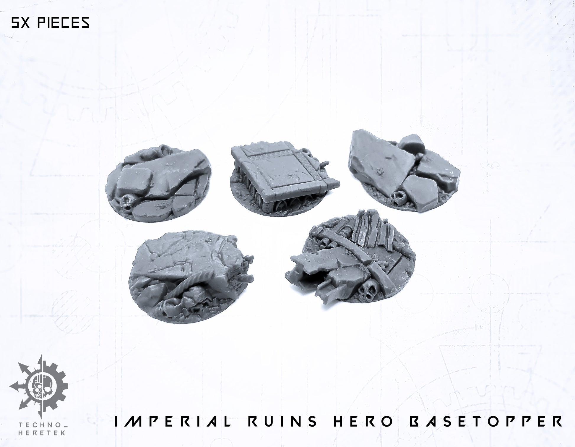 Base Toppers in a ruined city/battlezone theme. They can also fit for a wasteland or mars style paint scheme. They are easy to glue onto your bases, perfect to finish your bases quickly and with style, giving your minis dramatic and elevated poses.