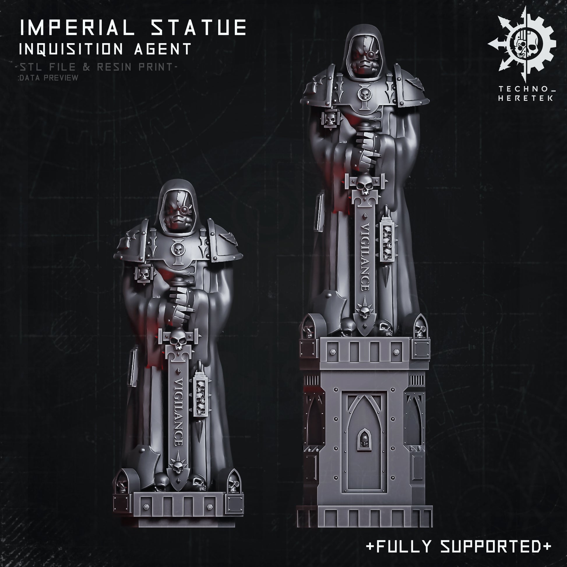A statue of an inquisitorial/ imperial Agent. A prestigious piece of holy imperial architecture, giving its surrounding place an aura of reverence and honor. Decorated with a detailed inscription (Vigilance) enhancing your terrains, play tables, and dioramas. The Statues can also be used for objectives in atmospheric and narrative games of Warhammer 40k and other wargames.